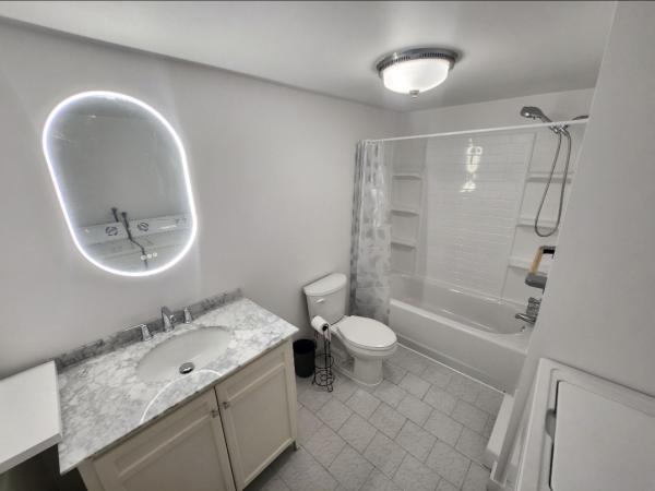 新品設備: バスタブ、照明、ベッドマットレス、洗濯機など。